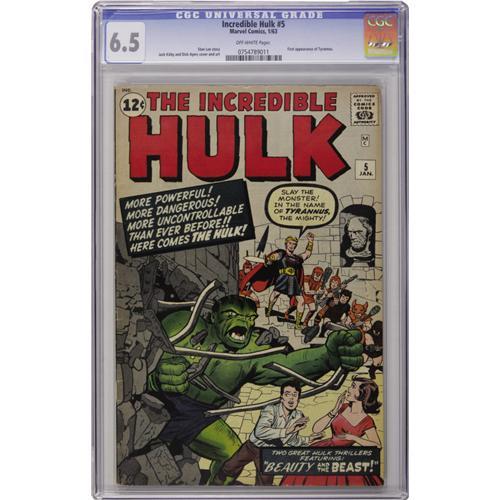 <B>The Incredible Hulk #5 (Marvel, 1963) CGC FN+ 6.5 Off-white pages.</B></I> This copy from a single owner collection features the first appearance of Tyrannus and a Jack Kirby and Dick Ayers cover. Kirby and Ayers also supply the interior art. Overstreet 2006 FN 6.0 value = $420; VF 8.0 value = $1,190. CGC census 9/06: 10 in 6.5, 57 higher. <I>From the Madison Monk Collection.</B></I><BR><BR><b>Shipping:</b> Slabbed Comic (<a target="_blank" href="http://www.heritageauctions.com/common/shipping.php">view shipping information</a>)