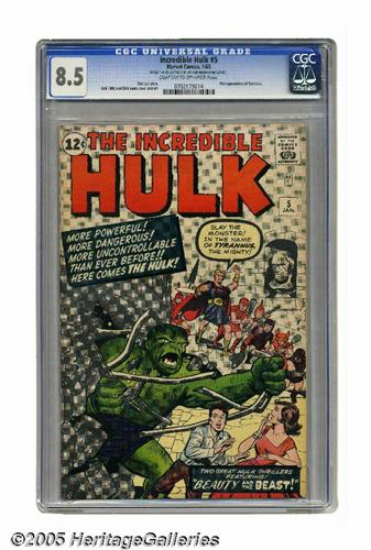 <B>The Incredible Hulk #5 (Marvel, 1963) CGC VF+ 8.5 Light tan to off-white pages.</B></I> The Hulk is at his monstrous best on Jack Kirby's cover for this issue, busting out of a steel cage and ready to rampage. Kirby and Dick Ayers provided the interior art. A gorgeous copy with sharp colors and none of the usual "Marvel chipping" so common in their early titles. Overstreet 2005 VF 8.0 value = $1,165; VF/NM 9.0 value = $1,883. CGC census 7/05: 2 in 8.5, 17 higher. <I>From the collection of Joe and Nadia Mannarino.</B></I>