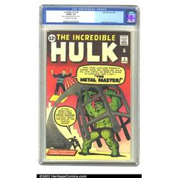 The Incredible Hulk #6 (Marvel, 1963) CGC FN/VF 7.0 Off-white to white pages. The only Steve Ditko issue in the run, this one has always stood out among the pack, featuring Greenskin taking on the Metal Master. Clean and bright, with exceptional colors, this copy received its grade due to a handful of Marvel chips and tears along the right edge, and some spine stresses. Overstreet 2002 FN 6.0 value = $468; VF 8.0 value = $1,326. Important notice: We expect to be auctioning lots at the rate of 200-250 per hour. Sometimes eBay Premier live bid software cannot keep up with that pace, so we strongly recommend that you place a realistic proxy bid now as insurance to avoid disappointment. Also please note that all Heritage/CAA lots purchased through eBay Premier carry a 20% Buyer's Premium. Please make sure you read the Terms and Conditions.