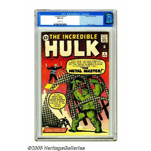 <B>The Incredible Hulk #6 (Marvel, 1963) CGC NM 9.4 Off-white pages.</B></I> It sometimes seems that Marvel could do no wrong in the early 1960s, but one of their goof-ups was giving up too soon on the Hulk the first time around, canceling his series after only six issues. This last issue of the original run is notable for having the first appearance of the Teen Brigade. It's also the only issue of the first six to be penciled by Steve Ditko. Overstreet 2005 NM- 9.2 value = 3,400. CGC census 9/05: 3 in 9.4, 3 higher. <BR><BR><B>Important notice:</B> Heritage usually auctions material at the rate of 200-250 lots per hour. On some occasions eBay Live bid software or the Internet may not be able to keep up with the pace of the auction. We recommend placing a realistic absentee bid now as insurance to avoid disappointment. Occasionally the auctioneer may eliminate or reject an eBay Live bid, and the auctioneer may also reopen a lot after the close of the eBay live bidding (usually because we missed an audience bid), and may reject your bid even if it shows you as the winning bidder. By bidding via eBay Live, you agree that Heritage may award the lot to another bidder at its sole discretion under the circumstances described above or any other reasonable circumstances. Since eBay bids are not shown to us until we open the lot on the floor, we treat those bids just like floor bids. In most cases the floor responds before the eBay bid is presented to us, due to Internet lag time, so for consistency we have made it a policy that floor bids are always considered first over tie eBay live bids. Also please note that all Heritage lots purchased through eBay Live carry a 20% Buyer's Premium. Please make sure you read the Terms and Conditions before you bid. This lot is being auctioned in conjunction with a live floor auction by Heritage Galleries & Auctioneers. All final auction and invoice information will be supplied by Heritage Galleries & Auctioneers, and all other informatio