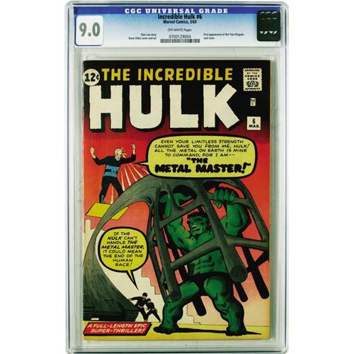 <B>The Incredible Hulk #6 (Marvel, 1963) CGC VF/NM 9.0 Off-white pages.</B></I> This final issue of the original <B>Hulk</B></I> series has the first appearance of the Teen Brigade, the group of young ham radio buffs formed by the Hulk's buddy Rick Jones. The youngsters would pop up in many a Silver Age issue thereafter. Both this issue's cover and the interior art are by Steve Ditko. Overstreet 2006 VF/NM 9.0 value = $2,548; NM- 9.2 value = $3,600. CGC census 1/06: 6 in 9.0, 11 higher.