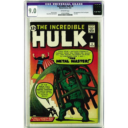 <B>The Incredible Hulk #6 (Marvel, 1963) CGC VF/NM 9.0 Off-white pages.</B></I> This final issue of the original <B>Hulk</B></I> series has the first appearance of the Teen Brigade, the group of young ham radio buffs formed by the Hulk's buddy Rick Jones. The youngsters would pop up in many a Silver Age issue thereafter. Both this issue's cover and the interior art are by Steve Ditko. Overstreet 2006 VF/NM 9.0 value = $2,548; NM- 9.2 value = $3,600. CGC census 6/06: 6 in 9.0, 11 higher. <BR><BR><B>Important notice:</B> Heritage usually auctions material at the rate of 200-250 lots per hour. On some occasions eBay Live bid software or the Internet may not be able to keep up with the pace of the auction. We recommend placing a realistic absentee bid now as insurance to avoid disappointment. Occasionally the auctioneer may eliminate or reject an eBay Live bid, and the auctioneer may also reopen a lot after the close of the eBay live bidding (usually because we missed an audience bid), and may reject your bid even if it shows you as the winning bidder. By bidding via eBay Live, you agree that Heritage may award the lot to another bidder at its sole discretion under the circumstances described above or any other reasonable circumstances. Since eBay bids are not shown to us until we open the lot on the floor, we treat those bids just like floor bids. In most cases the floor responds before the eBay bid is presented to us, due to Internet lag time, so for consistency we have made it a policy that floor bids are always considered first over tie eBay live bids. Also please note that all Heritage lots purchased through eBay Live carry a 22.5% Buyer's Premium. Please make sure you read the Terms and Conditions before you bid. This lot is being auctioned in conjunction with a live floor auction by Heritage Auction Galleries. All final auction and invoice information will be supplied by Heritage Auction Galleries, and all other information should be considered preliminary. Lot:41001 <BR><BR><B>Winning Notification and Billing:</B> After the FINAL session in this auction is complete, Heritage will send e-mail and snail mail invoices. This process normally takes several days. All final auction and invoice information will be supplied by Heritage Auction Galleries, and all other information should be considered preliminary. <BR><BR>This auction will be conducted on a live auction floor and over the Internet through eBay Live. If you choose to place an absentee bid, please take a moment to <font color='#0000ff'><u><a href='http://pages.ebay.com/liveauctions/help/before/laabsentee.html'>learn how eBay Live absentee bidding works</a></u></font><font color='#000000'>