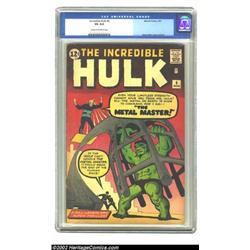 The Incredible Hulk #6 (Marvel, 1963) CGC VG 4.0 Cream to off-white pages. The final in the original groundbreaking series of six issues, found Steve Ditko taking over the cover and interior art duties from Jack Kirby. Overstreet 2002 GD 2.0 value = $156; FN 6.0 value = $468. Important notice: We expect to be auctioning lots at the rate of 200-250 per hour. Sometimes eBay Premier live bid software cannot keep up with that pace, so we strongly recommend that you place a realistic proxy bid now as insurance to avoid disappointment. Also please note that all Heritage/CAA lots purchased through eBay Premier carry a 20% Buyer's Premium. Please make sure you read the Terms and Conditions.