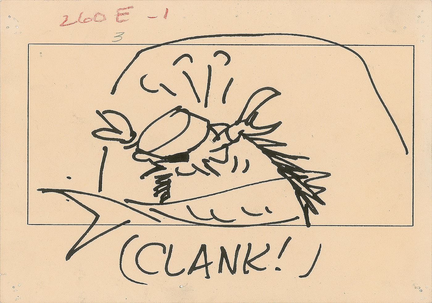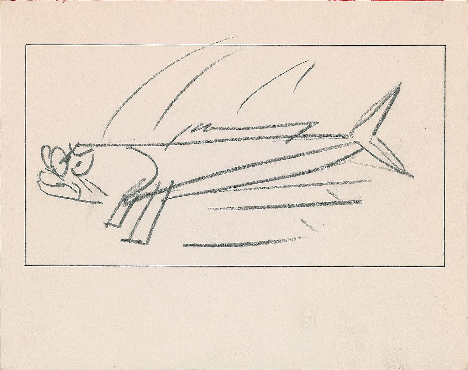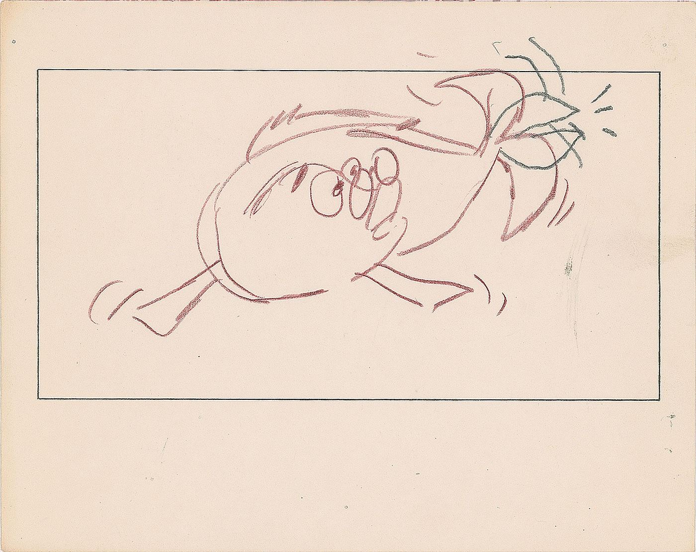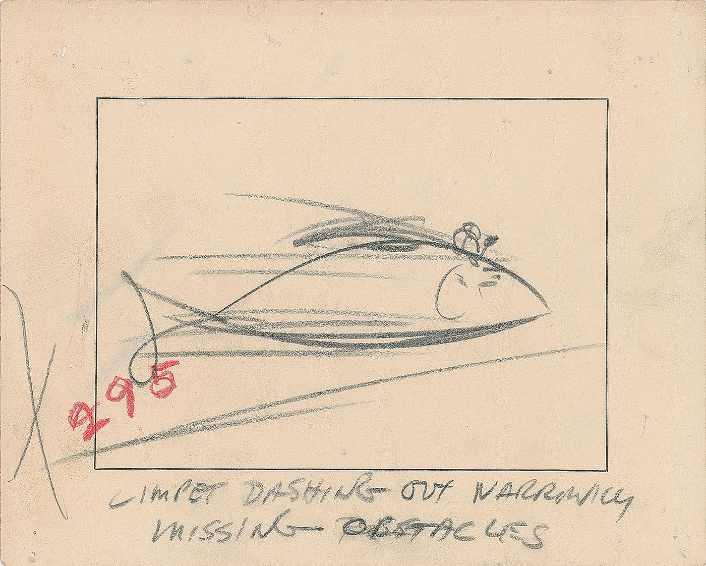 (Warner Bros., 1964) Five original storyboard drawings from the production of the classic live-action/animated fantasy adventure film The Incredible Mr. Limpet, accomplished in various media on individual off-white 7.25 x 5.75 sheets. Most show Mr. Limpet in his fish form, with one captioned, "Limpet dashing out narrowly missing obstacles," and another marked, "Clank!" In overall fine condition.