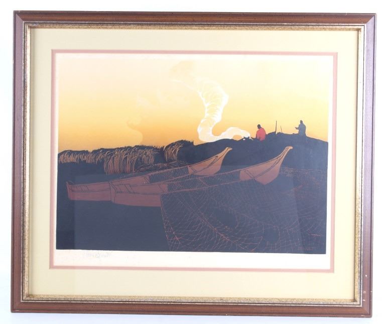 For your consideration is a signed original, "The Indian Coast" by Elton Bennett, a silkscreen or what he called "the gentle art of serigraph." In the painting, the native boats have reef nets spread onto the two boats and the shoreline, the fishermen are sitting close to a fire on a dune and appear to be praying as was and still is customary before and after a fish harvest. Silk screen printing was artist Elton Bennett's chosen medium. Using silkscreens allowed him to vary the work by changing the colors and recombining or reusing elements to the point where a work was never finished and continually evolving - he could always tinker with it and improve it more. For example, a catalog of his artwork might include multiple images of a scene such as "Around the Cape" using different color pallets, such as blues, gold, greens, etc. or the same middle-background sailing ship may appear in multiple scenes such as "Down to the Sea", "Return to the River", and "Forest of Spars". The coast of the Pacific Northwest, the sea, ships, and landscapes that Bennett grew up with and worked among were his primary subjects. People are relatively rare, and almost never the main subject, appearing as silhouettes on shore or on a ship. Often the rain and weather of the north pacific coast are nearly as prominent as the main subject. These elements often contribute to a peaceful loneliness in the images. The subjects also very much reflect the technology of the early period of his life. Tall ships, steam ships and old lumber mills are often featured in his prints. Sometimes the transition in technology is represented, as with the steam tug-boat pulling the sailing ship in "Down to the Sea" or the inboard-powered, double-ended fishing troller passing the schooner going the opposite direction in "Journey into Silence".