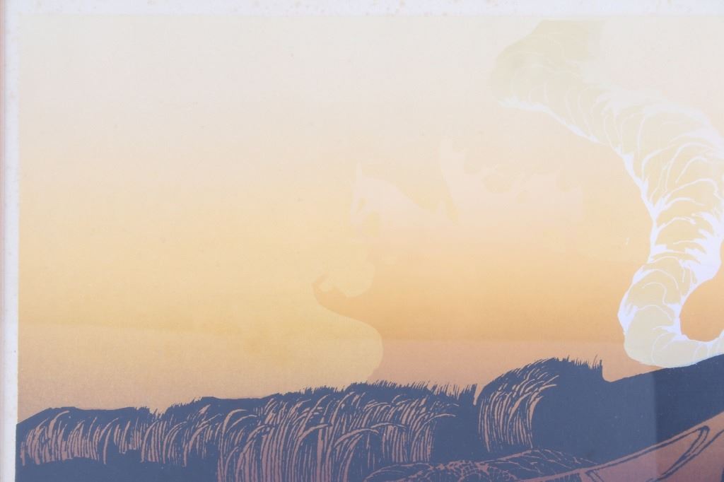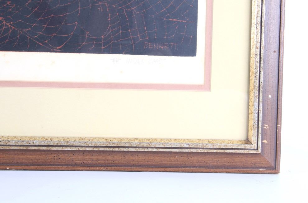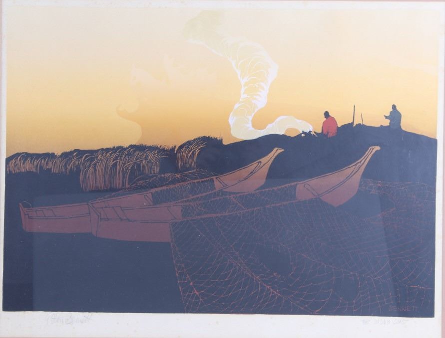 For your consideration is a signed original, "The Indian Coast" by Elton Bennett, a silkscreen or what he called "the gentle art of serigraph." In the painting, the native boats have reef nets spread onto the two boats and the shoreline, the fishermen are sitting close to a fire on a dune and appear to be praying as was and still is customary before and after a fish harvest. Silk screen printing was artist Elton Bennett's chosen medium. Using silkscreens allowed him to vary the work by changing the colors and recombining or reusing elements to the point where a work was never finished and continually evolving - he could always tinker with it and improve it more. For example, a catalog of his artwork might include multiple images of a scene such as "Around the Cape" using different color pallets, such as blues, gold, greens, etc. or the same middle-background sailing ship may appear in multiple scenes such as "Down to the Sea", "Return to the River", and "Forest of Spars". The coast of the Pacific Northwest, the sea, ships, and landscapes that Bennett grew up with and worked among were his primary subjects. People are relatively rare, and almost never the main subject, appearing as silhouettes on shore or on a ship. Often the rain and weather of the north pacific coast are nearly as prominent as the main subject. These elements often contribute to a peaceful loneliness in the images. The subjects also very much reflect the technology of the early period of his life. Tall ships, steam ships and old lumber mills are often featured in his prints. Sometimes the transition in technology is represented, as with the steam tug-boat pulling the sailing ship in "Down to the Sea" or the inboard-powered, double-ended fishing troller passing the schooner going the opposite direction in "Journey into Silence".