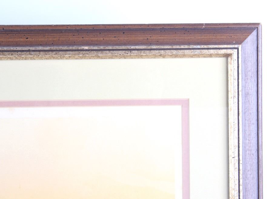 This artwork is in good condition, in a double matted gold gilt trimmed wood frame. Visible art measures 17.25"H x 23"W, frame is 25.5"H x 30.5"W