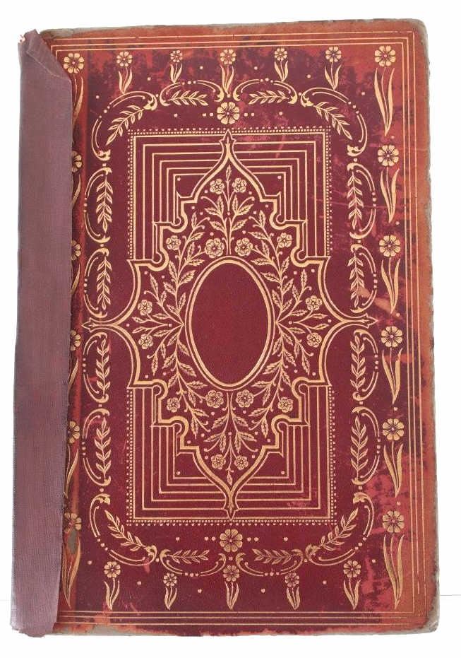 The condition is fair to good, the gold gilted (front cover) red clothbound covers are detached, library replaced spine, edges cloth are rubbed, page top edges are also gold gilted, though fore and bottom edges appear deckled from age, pages are fragile. 8.25"H x 5.75"W x .75"D