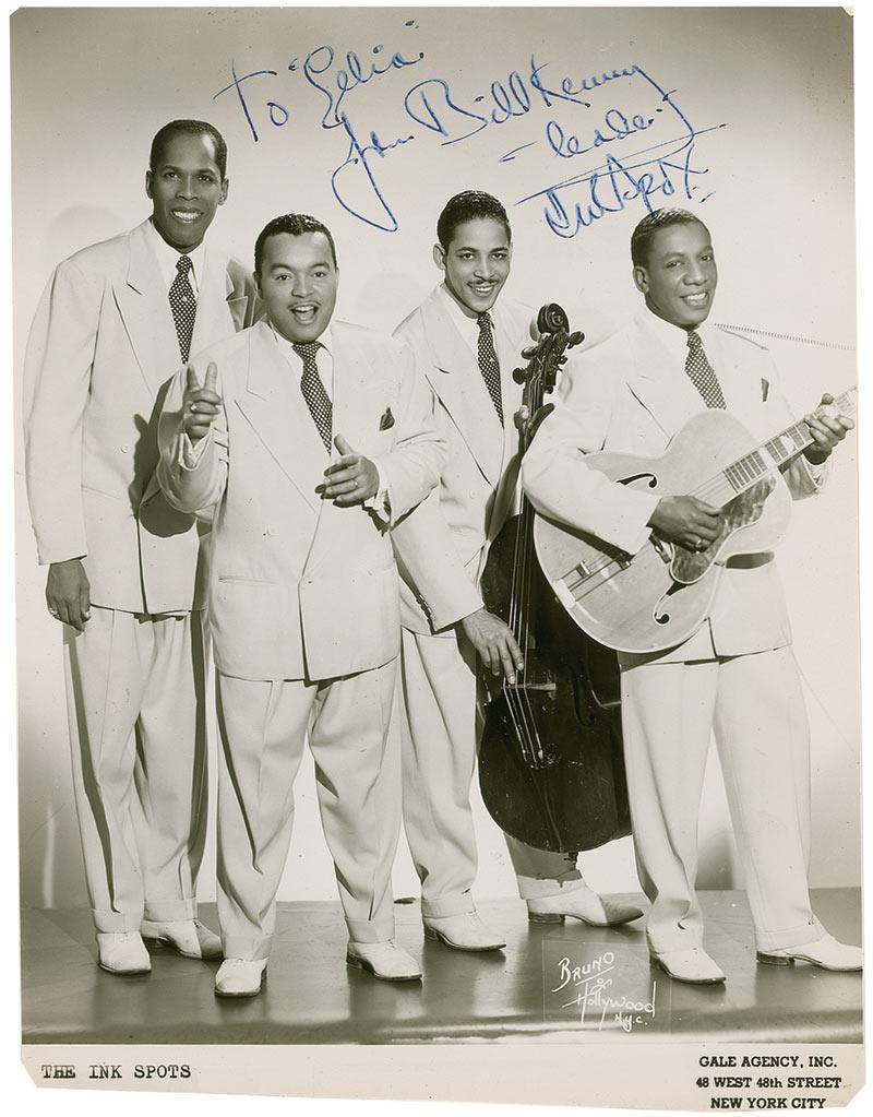 Vintage glossy 7.25 x 9.5 photo, signed and inscribed in fountain pen “To ‘Celia’ from Bill Kenny—leader—Ink Spots.” The original recipient has added detailed information about the encounter on the reverse. In fine condition, with clipped corners, a few surface marks, and trimmed edges.