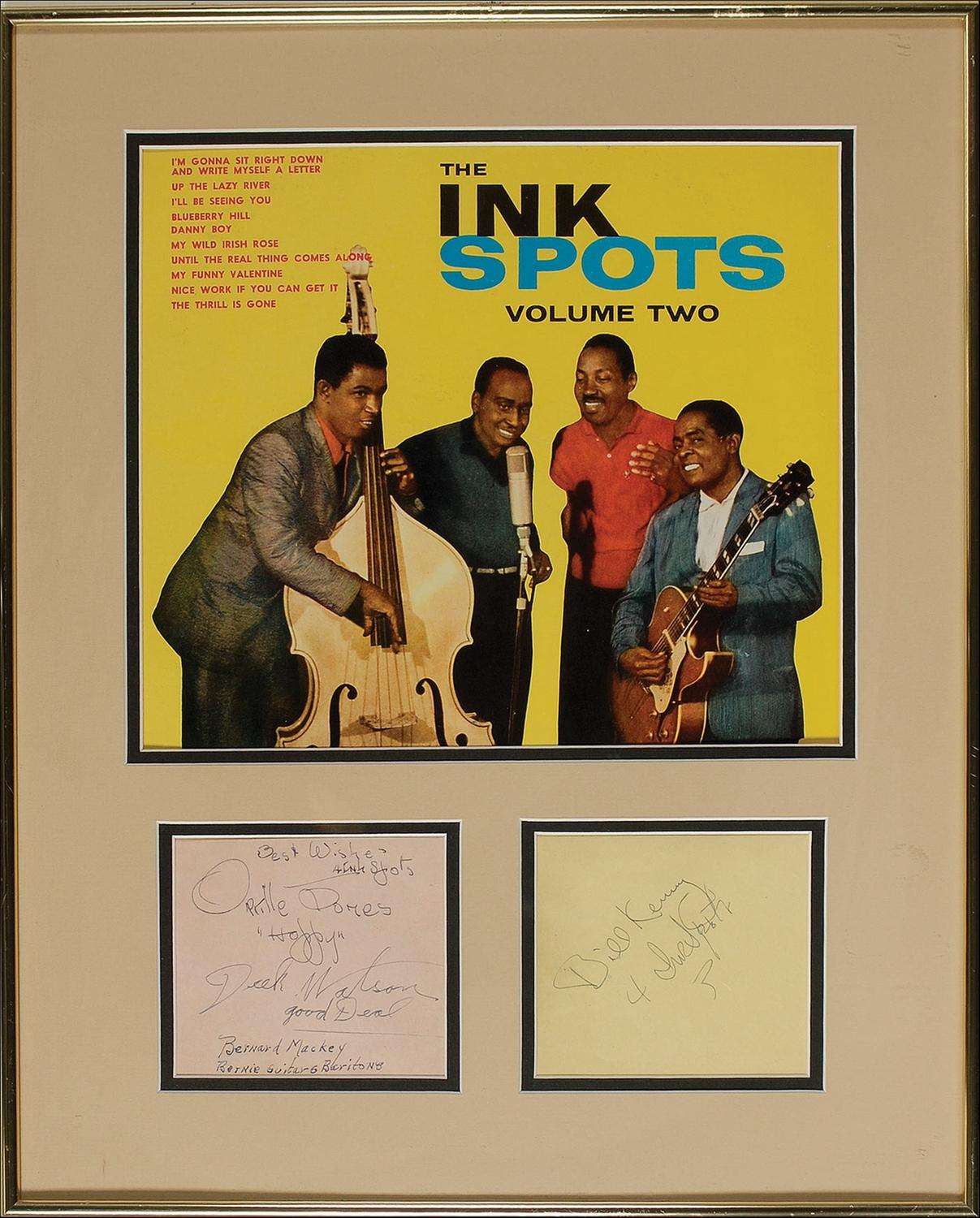 Four vintage ink signatures on two 4.5 x 4 album pages. “Billy Kenny, 4 Ink Spots” on a yellow page and Deek Watson, Orville Jones, and Bernard Mackey on a pink page, all three of whom added a sentiment. Double-matted with an Ink Spots Volume Two album and framed to an overall size of 16.25 x 20.25. In overall fine condition.