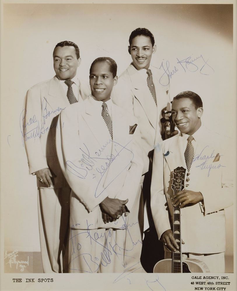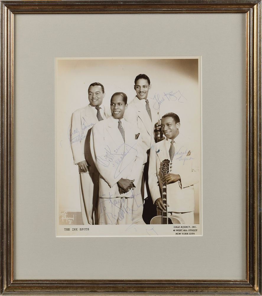 Vintage glossy 7.75 x 9.25 Bruno of Hollywood publicity photo of The Ink Spots in handsome matching suits, signed and inscribed in black ballpoint, "To Kayo, from, Bill Kenny," who also signs on his image, "Billy Bowen (Butterball)," "Herb Kenny," and "Charlie Fuqua." Matted and framed to an overall size of 13.75 x 15.5. In fine condition, with creasing along the tope edge. The original recipient, “Kayo,” assembled a well-known in-person collection through his job as a train conductor, where he acquired celebrities’ autographs as they rode the train.