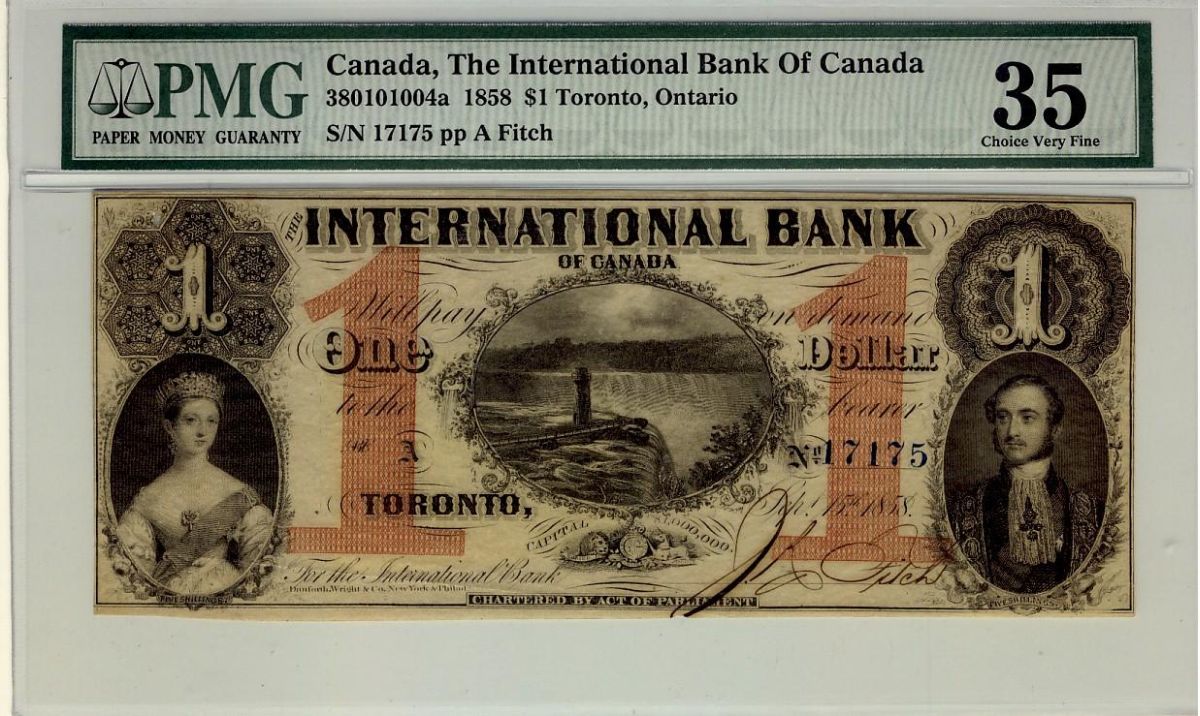 The International Bank, 1858 $1 #17175 CH-380-10-10-04a. PMG VF35.