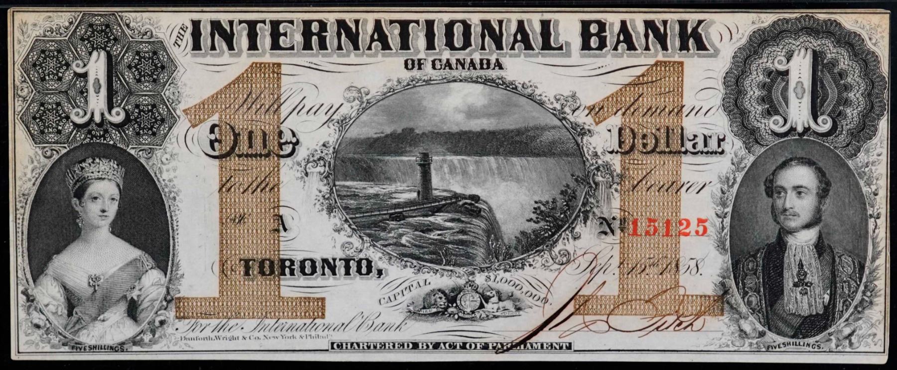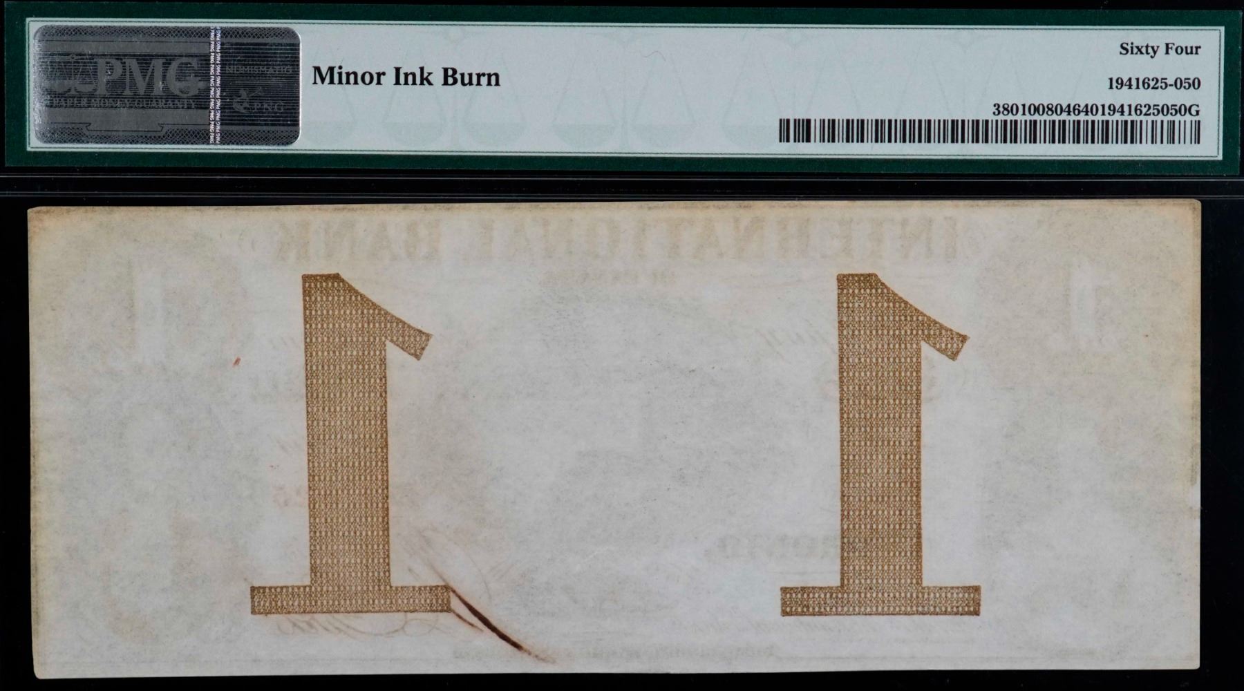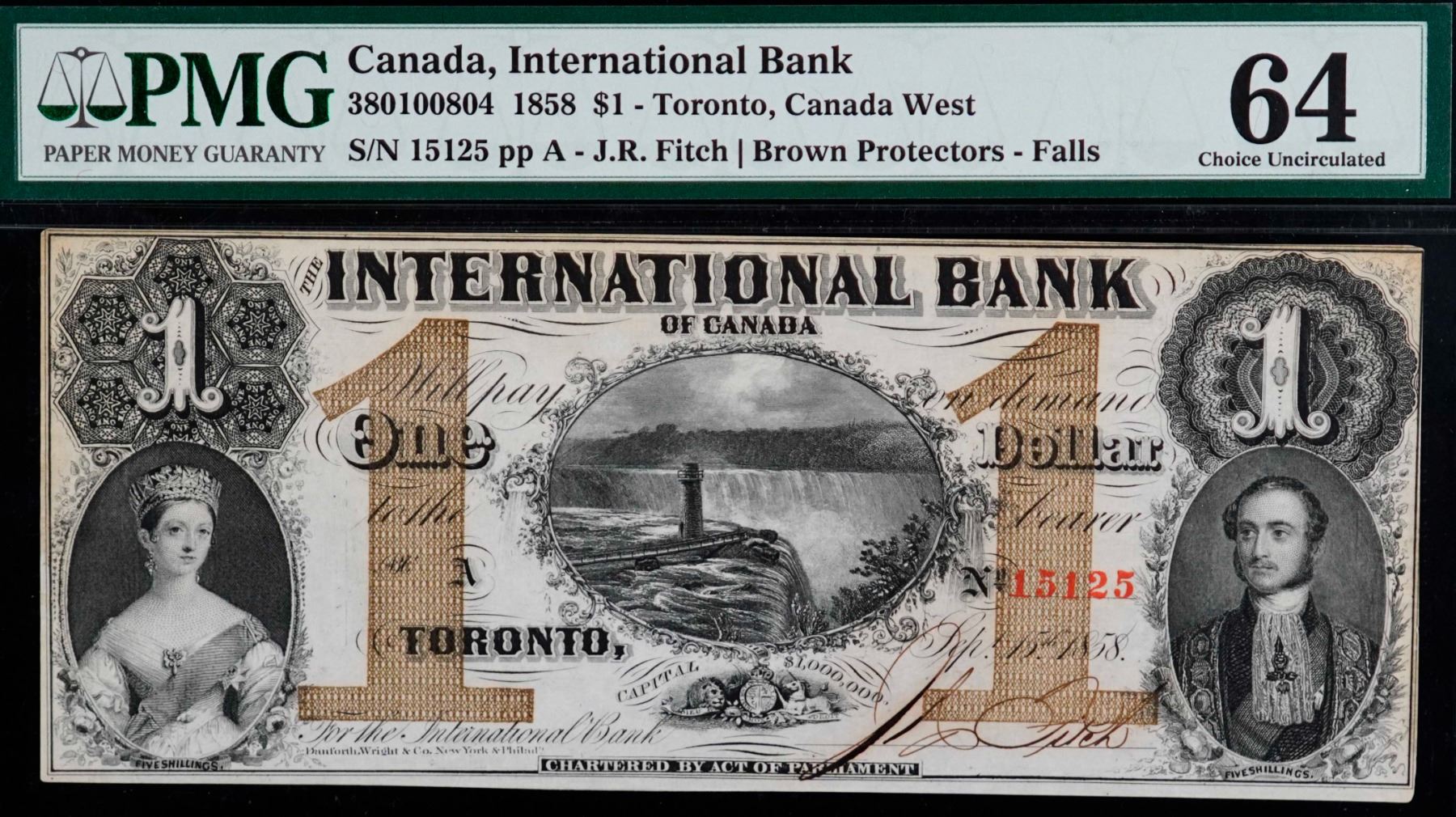 The International Bank of Canada; 1858 $1 #15125 CH-380-10-08-04, PMG Very Choice Uncirculated-64. Minor ink burn.