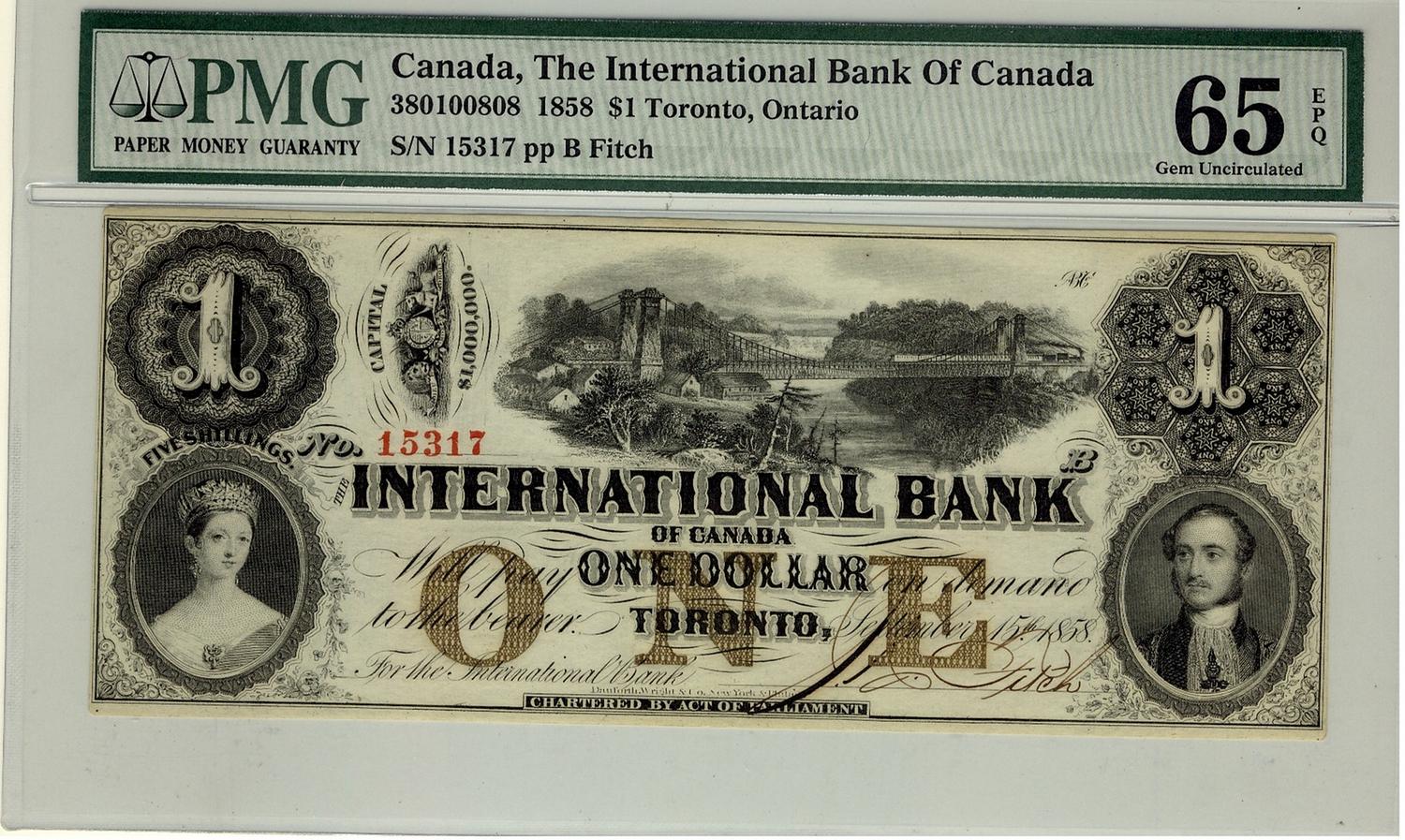 The International Bank of Canada, 1858 $1 #15317, CH-380-10-08-08, PMG Gem UNC65EPQ.