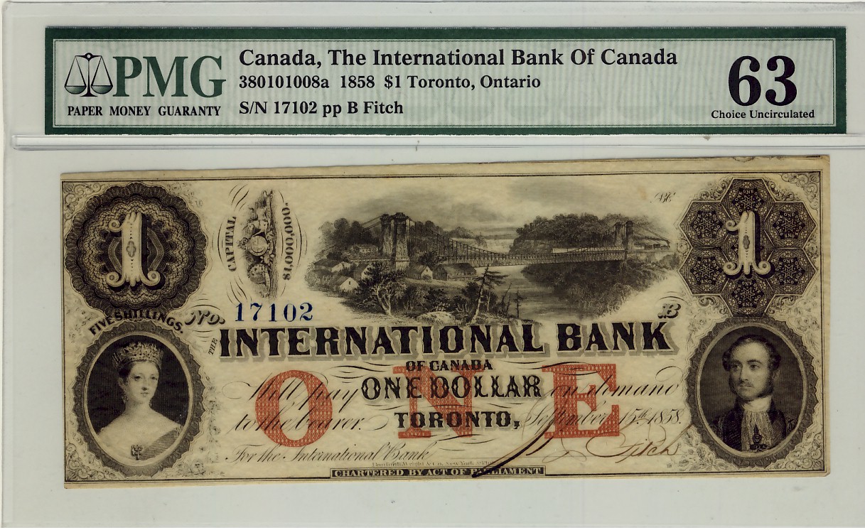The International Bank of Canada 1858 $1 17102 CH-380-10-10-08a PMG UNC63