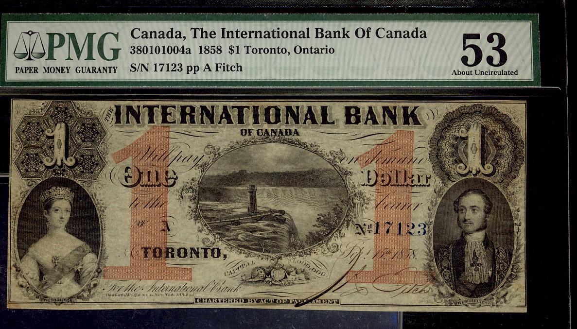 The International Bank of Canada 1858 $1 #17123 CH-380-10-10-08a PMG AU53. Smalll hole top right hand corner.