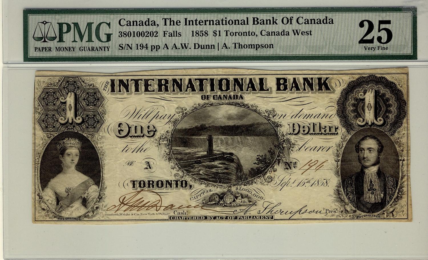 The International Bank of Canada, 1858 $1 #194, CH-380-10-02-02, PMG VF25. Rare Thompson signature.