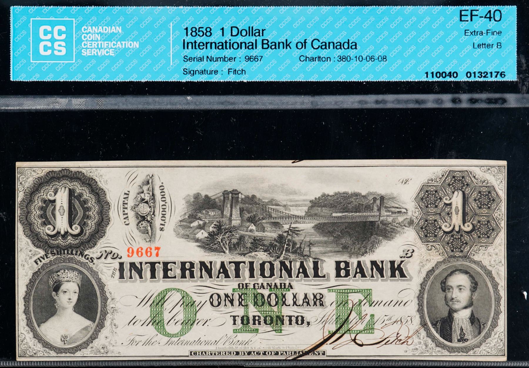 The International Bank of Canada 1858 $1 letter B #9667 CH-380-10-06-08 CCCS Extra Fine