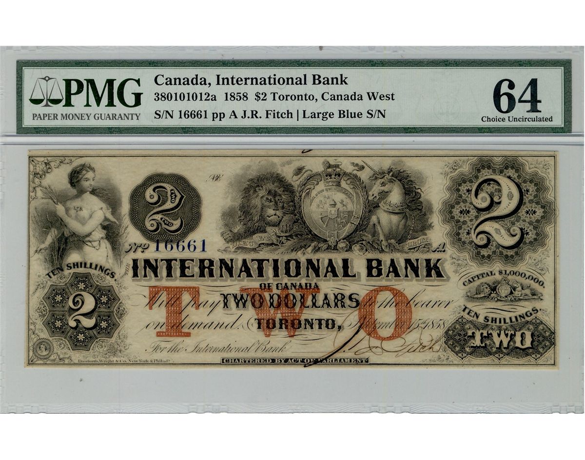 The International Bank of Canada; 1858 $2 #16661 RADAR CH-380-10-10-12a PMG CH UNC64.