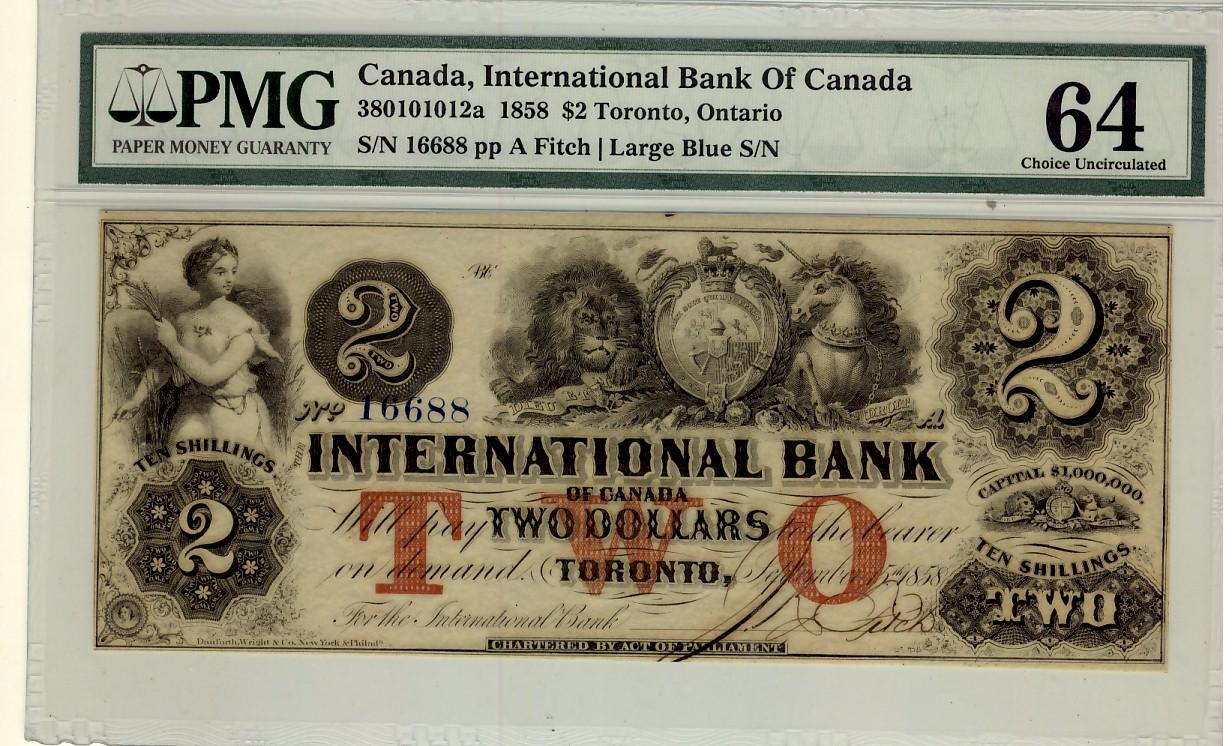 The International Bank of Canada 1858 $2 #16688 CH-380-10-10-12a PMG UNC64