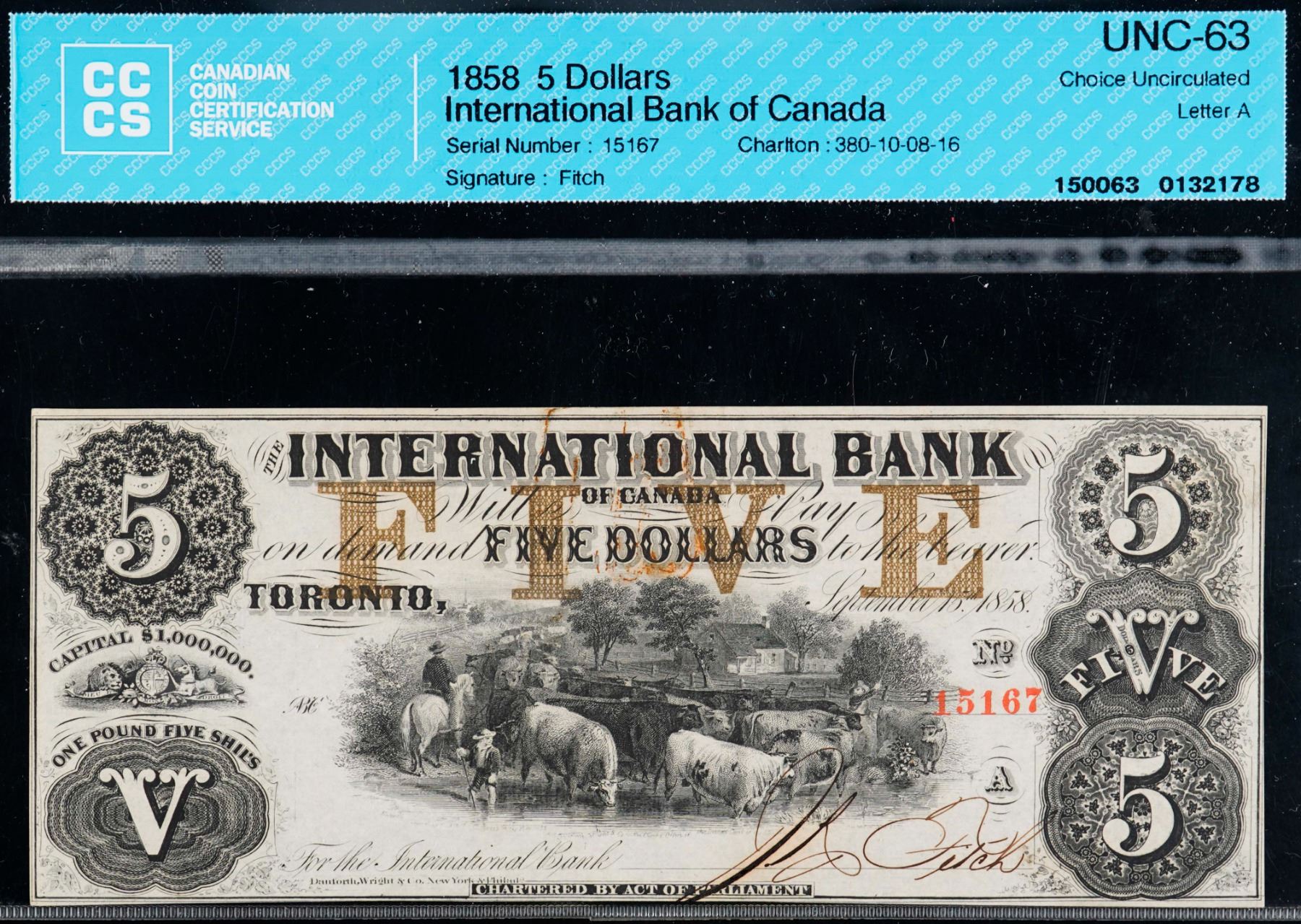 The International Bank of Canada 1858 $5 letter A #15167 CH-380-10-08-16 CCCS Choice Uncirculated-63
