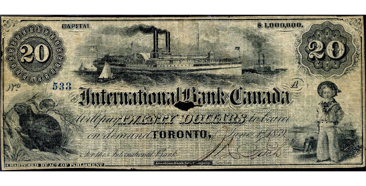 The International Bank of Canada; 1859 $20 #533 CH-380-12-04 PMG VG10 Net. Lg internal tear, piece missing.