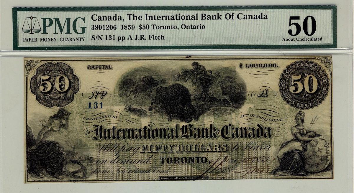 The International Bank of Canada, 1859 $50 RADAR NOTE #131, CH-380-12-06, PMG AU50. Best one seen by PMG.