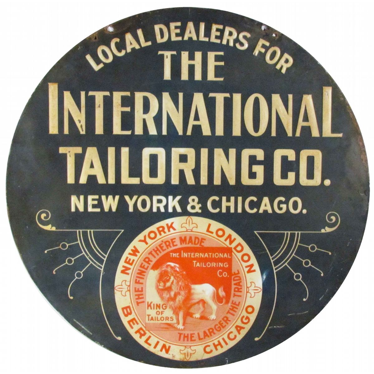 The International Tailoring Co. Embossed Tin Sign, two sided. Kaufman & Strauss Co. NY, Litho. Edge ware and a few surface scratches otherwise good condition. 21 1/2 inch diameter.