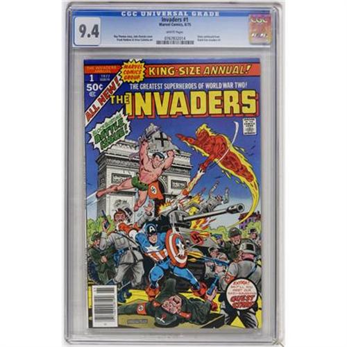 <B>The Invaders #1 (Marvel, 1975) CGC NM 9.4 White Pages.</B></I> John Romita Sr. cover. Frank Robbins and Vince Colletta art. Overstreet 2007 NM- 9.2 value = $65. CGC census 10/07: 81 in 9.4, 106 higher.<BR><BR><b>Shipping:</b> Comics - Slabbed (certified) (<a target="_blank" href="http://www.heritageauctions.com/common/shipping.php">view shipping information</a>)