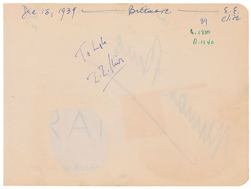Welsh character actor (1879–1940) who made his debut as rural police officer Constable Jaffers in The Invisible Man. Vintage ink signature and inscription, “To Lyle, E. E. Clive,” on an off-white 5.75 x 4.25 album page, with collector’s notations along top dated December 18, 1939. In fine condition, with some light show-through from a photo affixed to reverse.