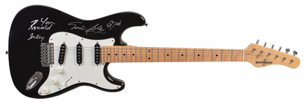 Black-bodied Behringer electric guitar, signed on the body in silver ink, "Love, Ronald Isley" and "Ernie Isley, '97.'" In fine condition.