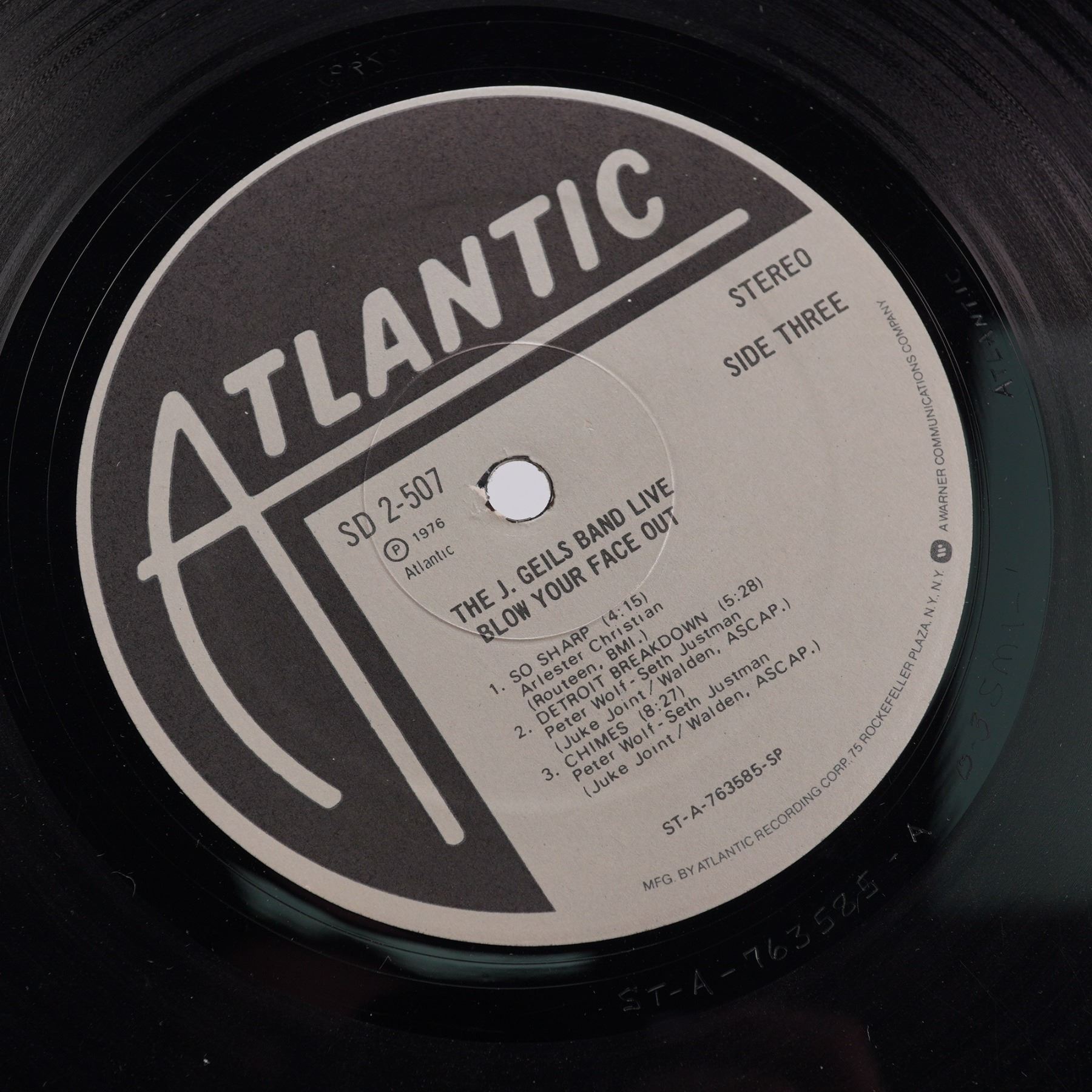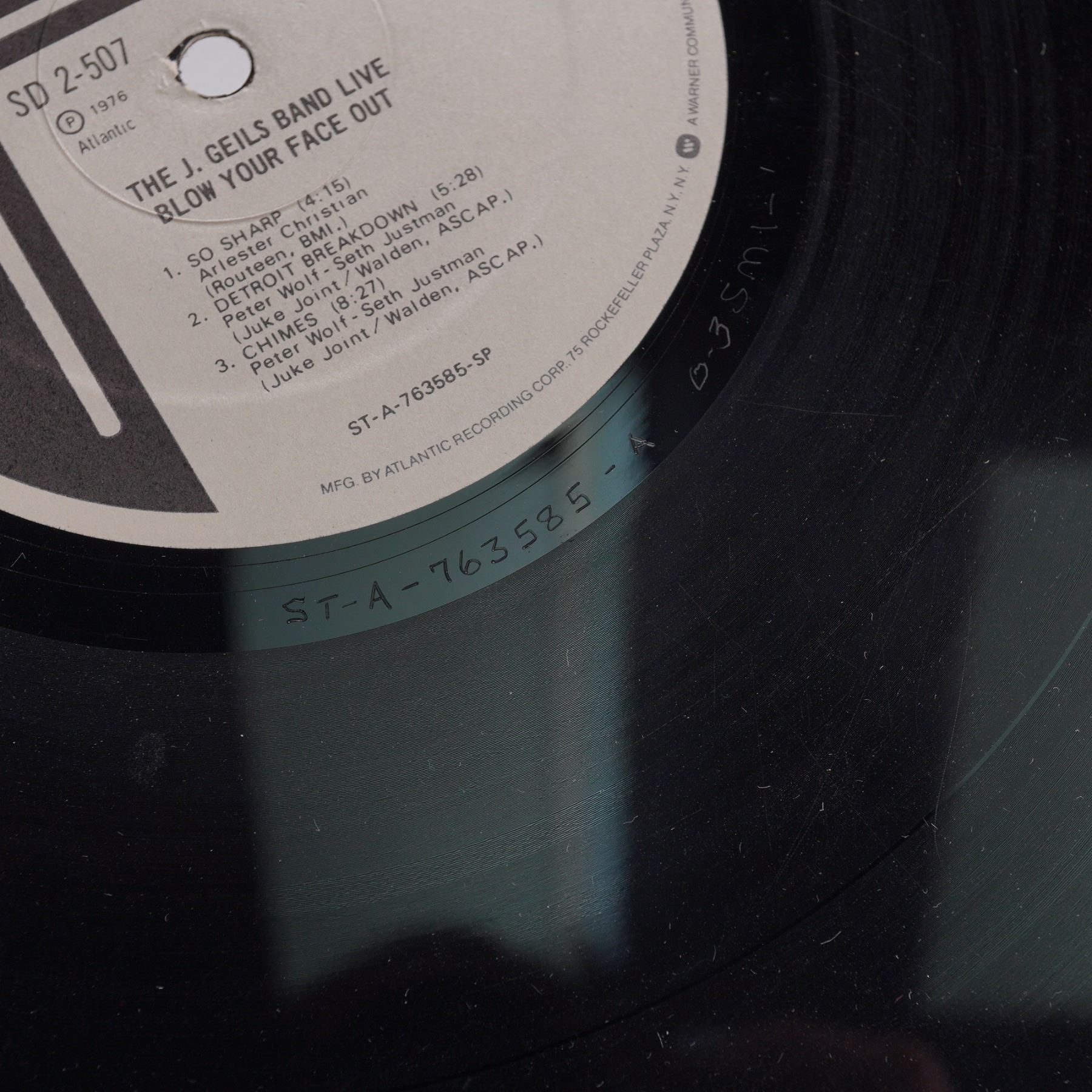 The J. Geils Band vinyl, Blow Your Face Out, Atlantic Records. Original 1976 double live album recorded in concert in Boston and Detroit. Features bold black and white typographic gatefold cover with red LIVE accent and monochrome Atlantic label. Includes high-energy tracks such as Detroit Breakdown and Musta Got Lost.