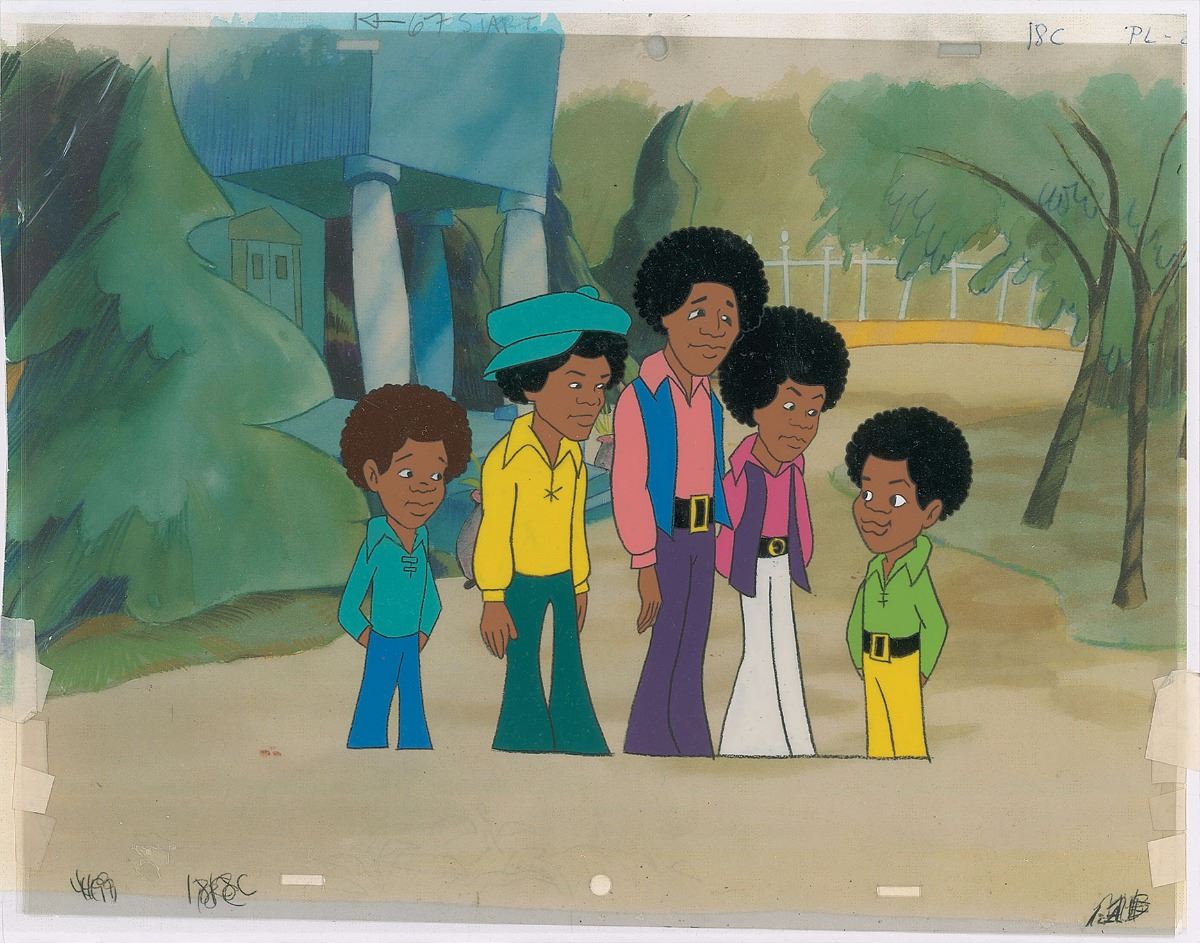 (Rankin Bass/Motown Productions, 1971) Scarce original production cel featuring all five members of The Jackson 5 from The Jackson 5ive. The cel is placed on a color copy background. Image measures 7.5 x 6.25, with overall dimensions of 14 x 11. In fine condition, with creases to upper left.