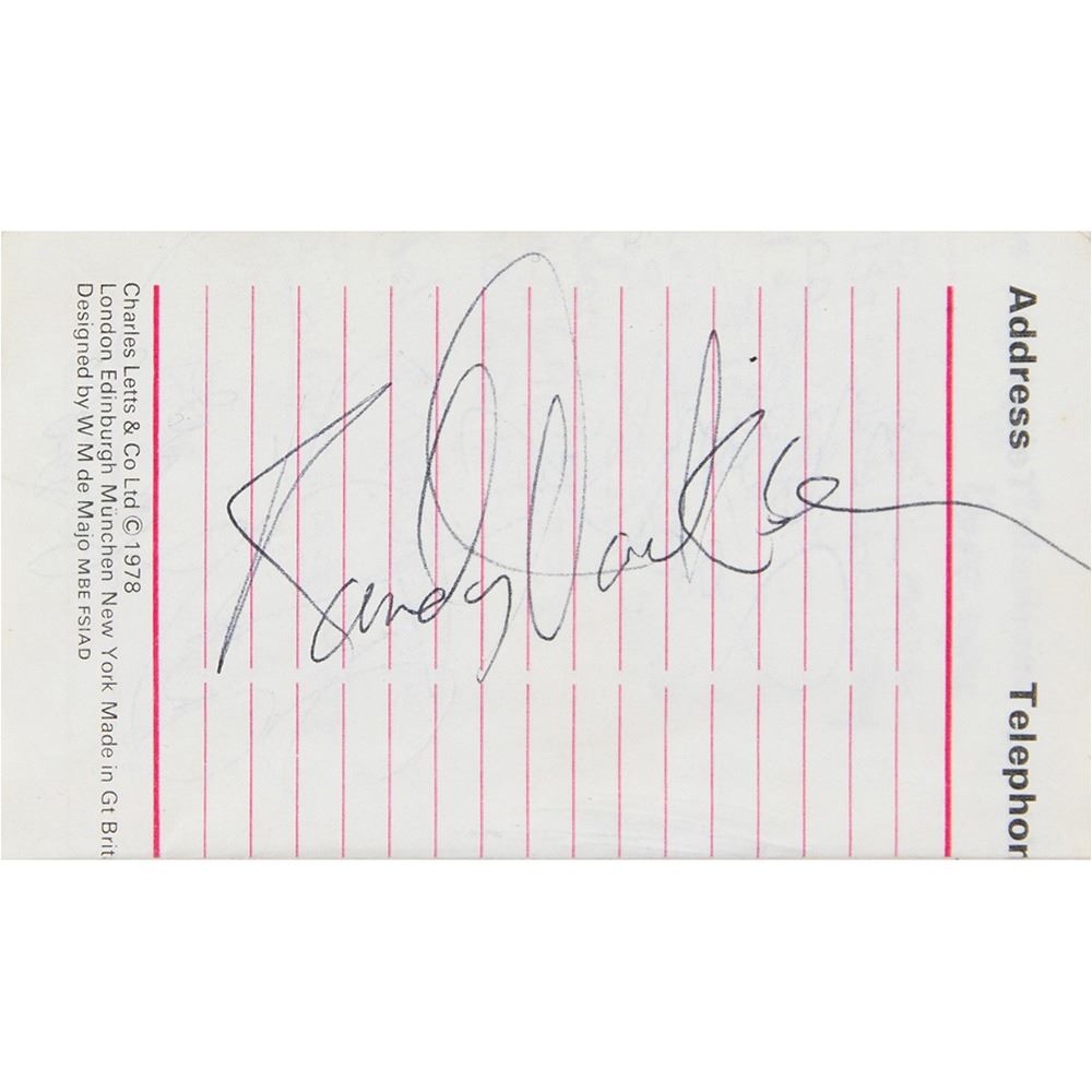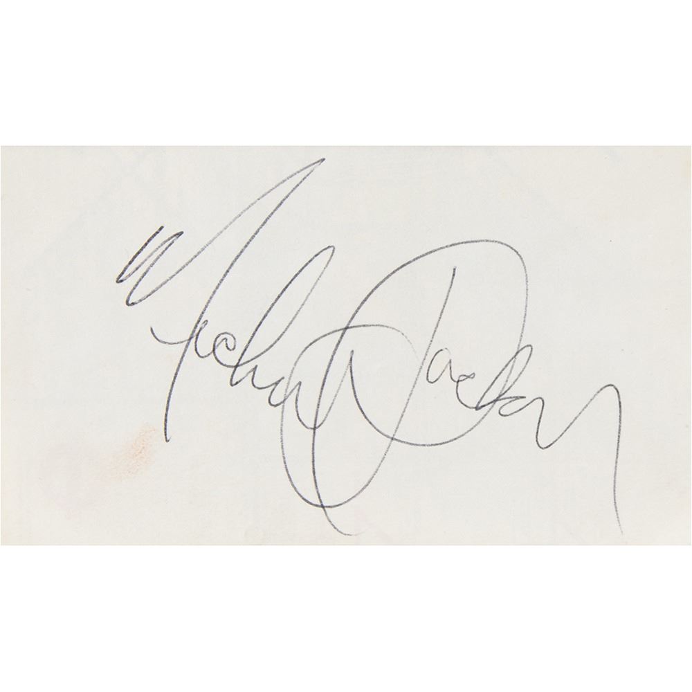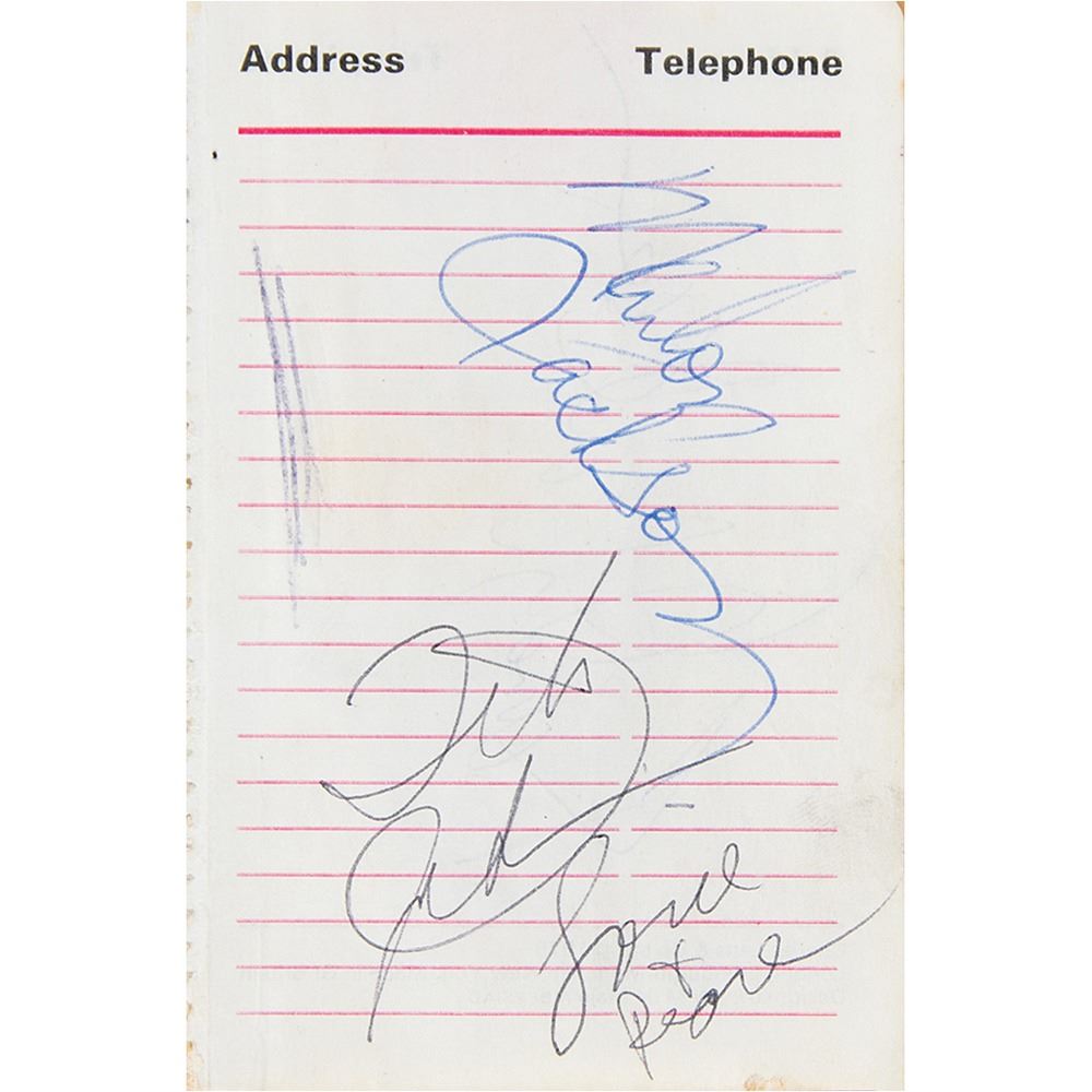 A gold-tone 1979 pocket diary, 3 x 4.25, signed inside on the last three pages in ballpoint by Michael Jackson, Randy Jackson, Marlon Jackson, and Tito Jackson, who adds “Love & Peace.”’ The consignor notes that the autographs were obtained in London, England, in February 1979, when the Jacksons were performing at the Rainbow Theatre between February 6 and 9, 1979. In fine condition. Accompanied by a certificate of authenticity from Tracks.