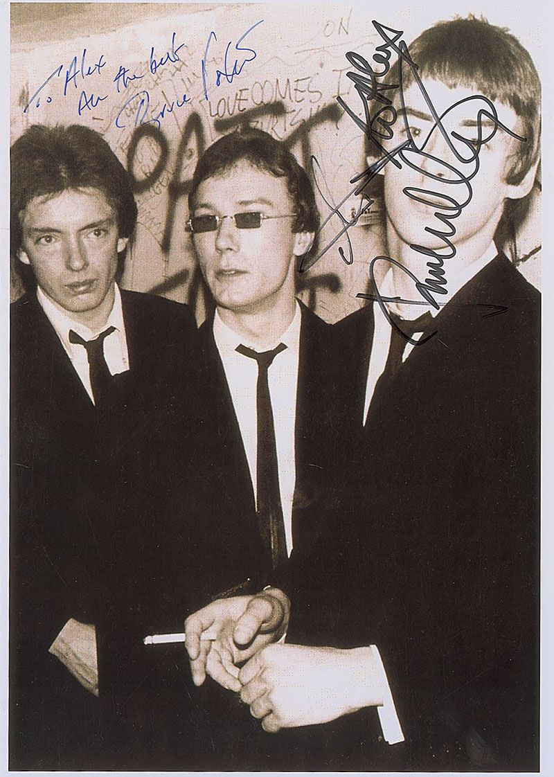 Lightweight cardstock 8.25 x 11.75 photo, signed and inscribed in blue felt tip, “To Alex, all the best, Bruce Foxton,” and signed in black felt tip by Paul Weller and Rick Buckler. In fine condition.