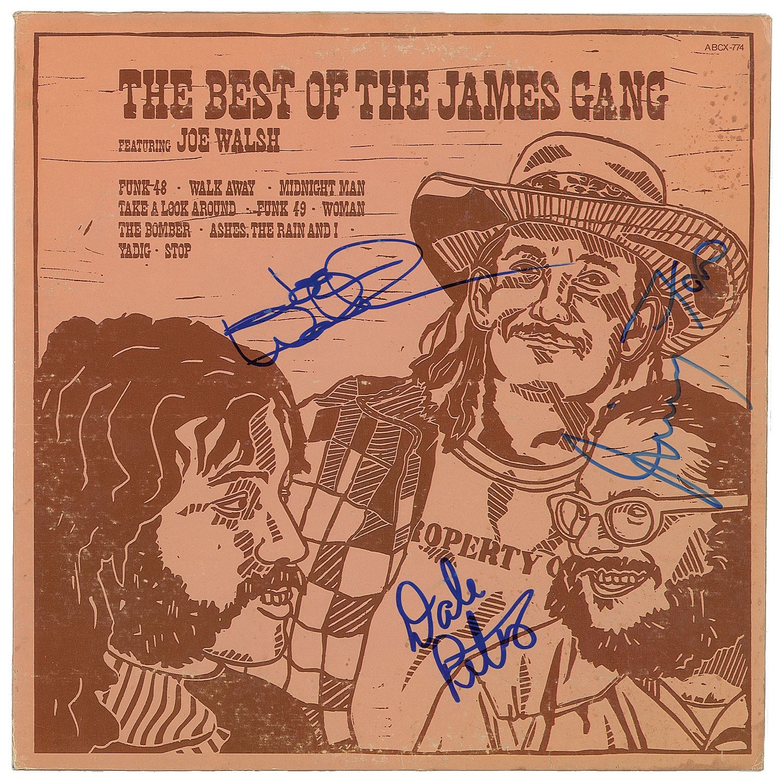 The Best of the James Gang album signed on the front cover in blue felt tip by Joe Walsh, Jim Fox, and Dale Peters. In fine condition, with light scuffing. The record is included.