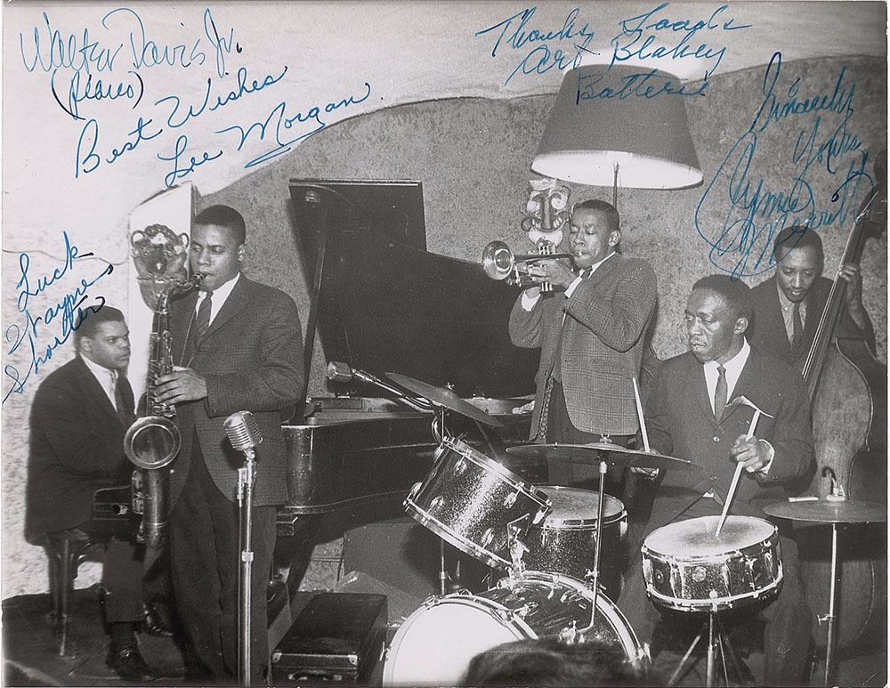 Influential jazz combo that existed for over thirty-five years beginning in the early 1950s as a collective, and ending when longtime leader and founding drummer Art Blakey died in 1990. Vintage glossy 9 x 7 photo of the Jazz Messengers during a performance, signed in fountain pen, "Thanks Loads, Art Blakey, Batterie," "Best wishes, Lee Morgan," "Luck, Wayne Shorter," "Walter Davis Jr. (piano)," and "Sincerely yours, Jymie Merritt." In fine condition, with a light circular area of emulsion irregularity to the center of the photo.