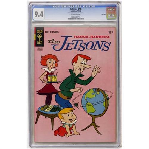 <B>The Jetsons #18 File Copy (Gold Key, 1965) CGC NM 9.4 Off-white pages.</B></I> CGC notes, "From the Random House Archives." Overstreet 2007 NM- 9.2 value = $105. CGC census 10/07: 6 in 9.4, 3 higher.<BR><BR><b>Shipping:</b> Comics - Slabbed (certified) (<a target="_blank" href="http://www.heritageauctions.com/common/shipping.php">view shipping information</a>)