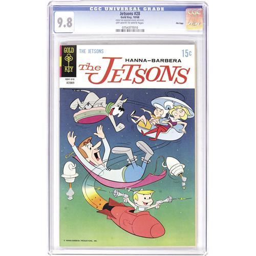 <B>The Jetsons #28 File Copy (Gold Key, 1968) CGC NM/MT 9.8 Off-white to white pages.</B></I> George, Elroy, Judy, Jane, Astro, and 9.8... what more could the Jetsons fan ask for? Overstreet 2006 NM- 9.2 value = $80. CGC census 5/06: 2 in 9.8, none higher. <I>From the Random House Archives</B></I>. <BR><BR><B>Important notice:</B> Heritage usually auctions material at the rate of 200-250 lots per hour. On some occasions eBay Live bid software or the Internet may not be able to keep up with the pace of the auction. We recommend placing a realistic absentee bid now as insurance to avoid disappointment. Occasionally the auctioneer may eliminate or reject an eBay Live bid, and the auctioneer may also reopen a lot after the close of the eBay live bidding (usually because we missed an audience bid), and may reject your bid even if it shows you as the winning bidder. By bidding via eBay Live, you agree that Heritage may award the lot to another bidder at its sole discretion under the circumstances described above or any other reasonable circumstances. Since eBay bids are not shown to us until we open the lot on the floor, we treat those bids just like floor bids. In most cases the floor responds before the eBay bid is presented to us, due to Internet lag time, so for consistency we have made it a policy that floor bids are always considered first over tie eBay live bids. Also please note that all Heritage lots purchased through eBay Live carry a 22.5% Buyer's Premium. Please make sure you read the Terms and Conditions before you bid. This lot is being auctioned in conjunction with a live floor auction by Heritage Auction Galleries. All final auction and invoice information will be supplied by Heritage Auction Galleries, and all other information should be considered preliminary. Lot:41001 <BR><BR><B>Winning Notification and Billing:</B> After the FINAL session in this auction is complete, Heritage will send e-mail and snail mail invoices. This process normally takes several days. All final auction and invoice information will be supplied by Heritage Auction Galleries, and all other information should be considered preliminary. <BR><BR>This auction will be conducted on a live auction floor and over the Internet through eBay Live. If you choose to place an absentee bid, please take a moment to <font color='#0000ff'><u><a href='http://pages.ebay.com/liveauctions/help/before/laabsentee.html'>learn how eBay Live absentee bidding works</a></u></font><font color='#000000'>