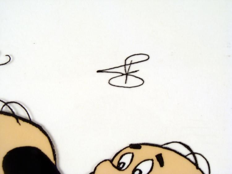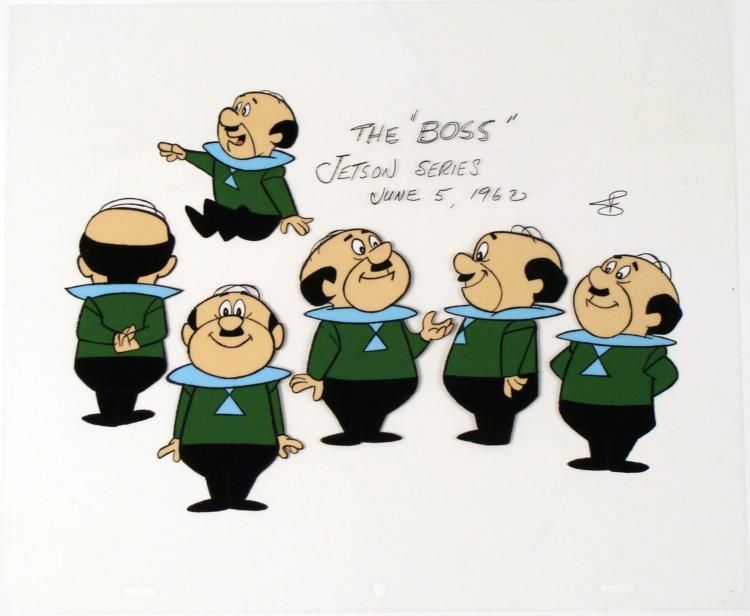 This is an original signed production cel from the hit tv show "The Jetsons". Bob Singer signed the cel at the bottom in black sharpie. * * * George Jetson is married and lives with his family in the Skypad Apartments in Orbit City, where all homes and businesses are raised high above the ground on adjustable columns in the Googie style, reflective of Seattle's Space Needle * and the Theme Building of the Los Angeles International Airport. George is married to Jane, the homemaker, and the couple have two children: teenage daughter Judy; and preteen son Elroy. Housekeeping is seen to by a robot maid, Rosie, handling chores not otherwise * rendered trivial by the home's numerous push-button Space Age-envisioned conveniences. The family has a dog named Astro, who talks with an initial consonant mutation in which every word begins with an 'R', as if speaking with a growl.Jetson's workweek is typical * of his era: three hours a day, three days a week. His boss is Cosmo Spacely, the bombastic owner of the company Spacely Space Sprockets. Spacely has a competitor, H. G. Cogswell, owner of the rival company Cogswell Cogs (sometimes known as Cogswell's Cosmic * Cogs). Jetson commutes to work in an aerocar that resembles a flying saucer with a transparent bubble top. Daily life is leisurely, assisted by numerous labor-saving devices, which occasionally break down with humorous results. Despite this, everyone complains * of exhausting hard labor and difficulties of living with the remaining inconveniences. * * Depicted here is a collage of the better sides of Cosmo Spacely, before he starts hollering at George... * * * * * * Original Animation CelTitle: "The Boss" * * Overall Size of the Cel: 10 1/2" x 12 1/2"Date: June 5, 1962 * * Condition: Excellent * * * This is an original hand-painted animation cel. Each one-of-a-kind cel represents a slight change in position of the characters. When individually photographed and projected in rapid succession, the images appear to move. * * To create production cels, the original animator's drawing is transferred onto an acetate cel (by hand-inking and/or photo copying). The cel is then hand-painted on the reverse side. * * * * * The cel is ready to be matted and framed. The animators notations are located at the top of the cel. * * * *
