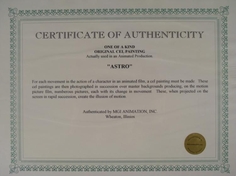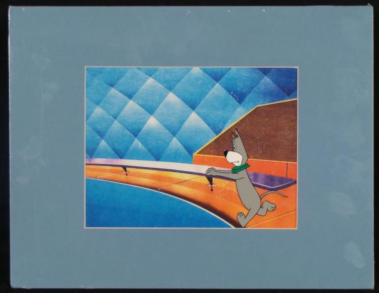 This is an original animation cel used in the production of The Jetsons cartoon. Shown here is George Jetson's dog Astro, looking a little concerned as he runs through a space command center. * * Medium: Hand-inked and hand-painted acetate cel, with printed backgroundImage size: 10 1/2 x 8 inches Presentation: Matted in blue * Matte size: 18 x 14 inchesCondition: Excellent; sealed in cellophaneCertificate of Authenticity: Included