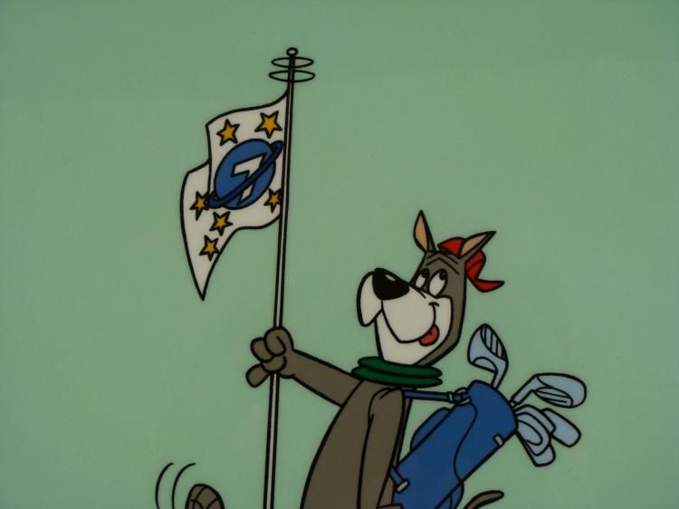 It appears that Astro is helping George Jetson hit his ball into the hole. This is a cel from the production of the TV show "The Jetsons." * * Size of Cel: 10 3/4 x 14 inchesHanna-Barbera trademarked on the bottom right of the cel * Original Serigraph CelLimited EditionCondition: Excellent *