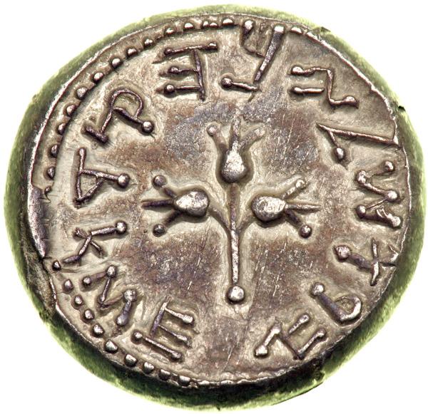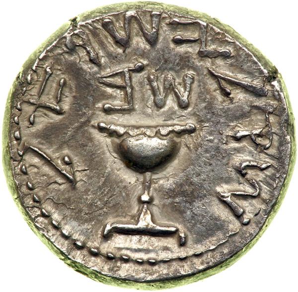 The Jewish War, 66-70 CE. AR Shekel (13.51 g) dated year 2 (67/8 CE). Temple vessel with rim decorated with nine pearls; above, date. Reverse: Stem with three pomegranate fruits. Mesh1 151; H-659. About Extremely Fine.