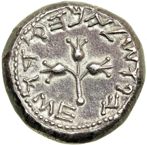 While there is controversy about the obverse chalice, it is likely to represent one in Temple use. The diameter of the cup was measured by a branch of three budding pomegranates, as shown on the reverse. Another theory is that the branch was used in the staff carried by the high priests and/or those in charge of the minting process .