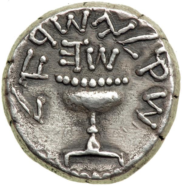 The Jewish War, 66-70 CE. AR Shekel (14.00 g) dated Year 5 (April-August 70 CE). Temple vessel (omer cup?) with rim decorated with nine pearls; above, date and surrounding Palaeo-Hebrew inscription "Shekel of Israel". Reverse: Stem with three budding pomegranates; around, Palaeo-Hebrew inscription "Jerusalem the Holy". TJC 215a; H-1370a. Class II. As struck. Extremely Fine. .