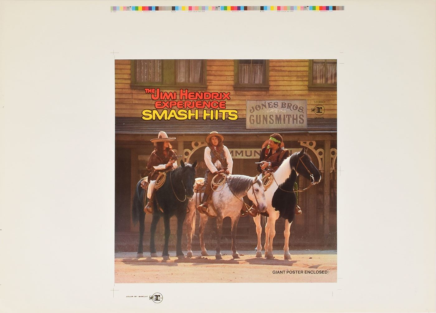 Extremely scarce album cover proof of never-produced artwork for the Jimi Hendrix Experience's 1968 album Smash Hits, measuring 24.5 x 17.75, featuring an image of the band on horseback. The proof has color bars along the top and a Warner/Reprise logo at the bottom. This was the original artwork planned for Hendrix's third album (released only four months after Axis, Bold As Love). However, at some point a decision was made to scrap this artwork in favor of a multiple exposure photograph of Jimi alone. On the original US release, a poster using a cropped version of this photograph was included with the initial copies. This is one of a few proofs produced by Hendrix's label Reprise/Warner Bros. They were discarded by the label in the early 1970s and rescued from the dumpster by an enterprising employee. In fine condition. A compilation of singles by the Jimi Hendrix Experience, Smash Hits peaked at #4 on the British album chart and #6 on the Billboard 200. An incredibly desirable piece of alternative pre-production cover art. In 2016, a 5000-copy limited edition reissue of Smash Hits was issued for ‘Record Store Day’ using this artwork; the reissue was produced using a scan of the alternate cover provided by the consignor.