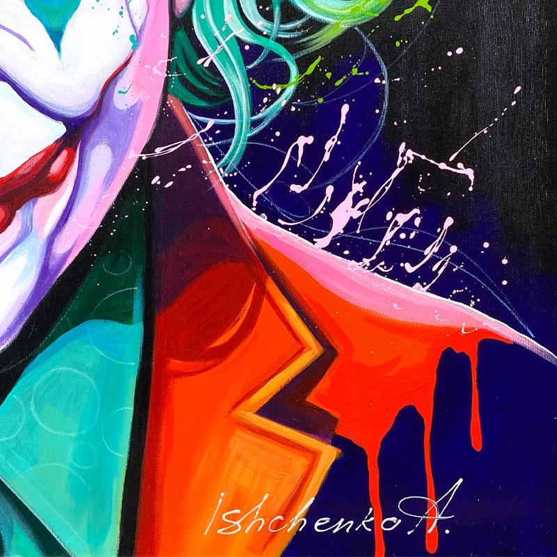 "The Joker" is an original acrylic painting on canvas by Alexander Ischenko, hand signed by the artist. Includes Letter of Authenticity. Measures approx. 36" x 36" (image).