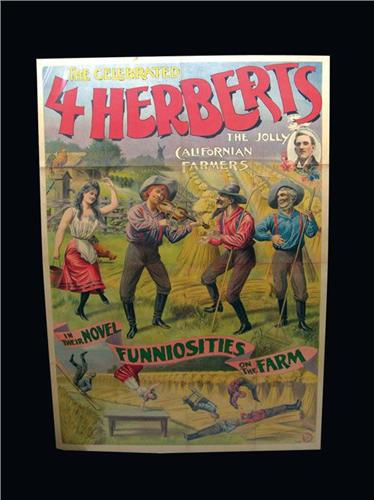 Theatrical poster for the celebrated 4 Herberts, The Jolly Californian Farmers. Stunning graphics, brilliant colors. Folds and creases otherwise excellent original condition. 37 X 53 inches.