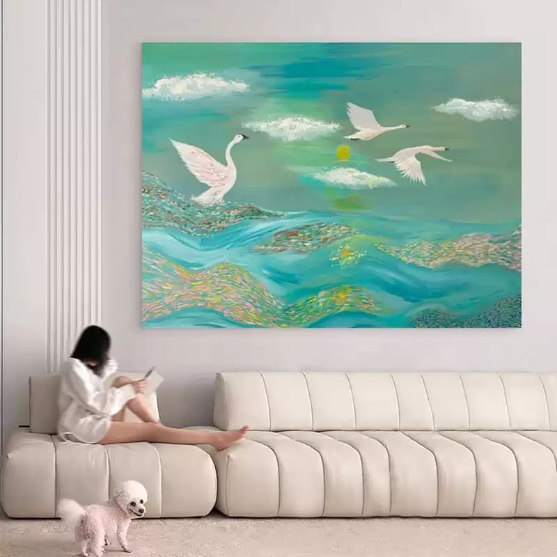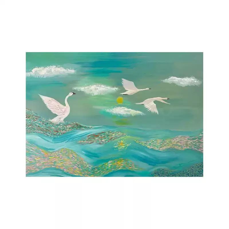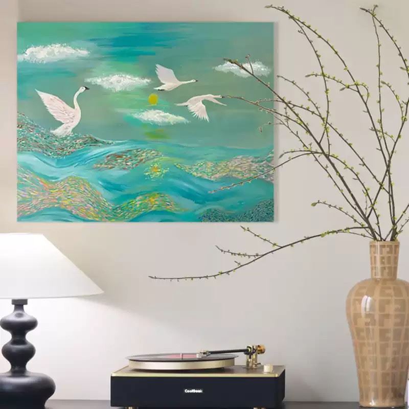 Rolling blue waves rise like silk, while three white swans stride on the water and soar through the sky, tracing graceful paths between clouds and sun. The scene feels like a moment paused in migration, symbolizing the courage to head into the distance and the quiet longing within. Dimensions: 31 x 24 inches.