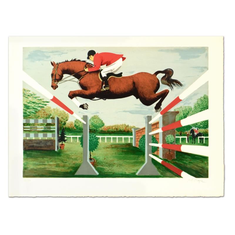 "The Jump" is a limited edition lithograph on paper by Pierre Charles Bayle, numbered and hand signed by the artist. Measures approx. 29.5" x 21" (border), 25.5" x 17" (image).